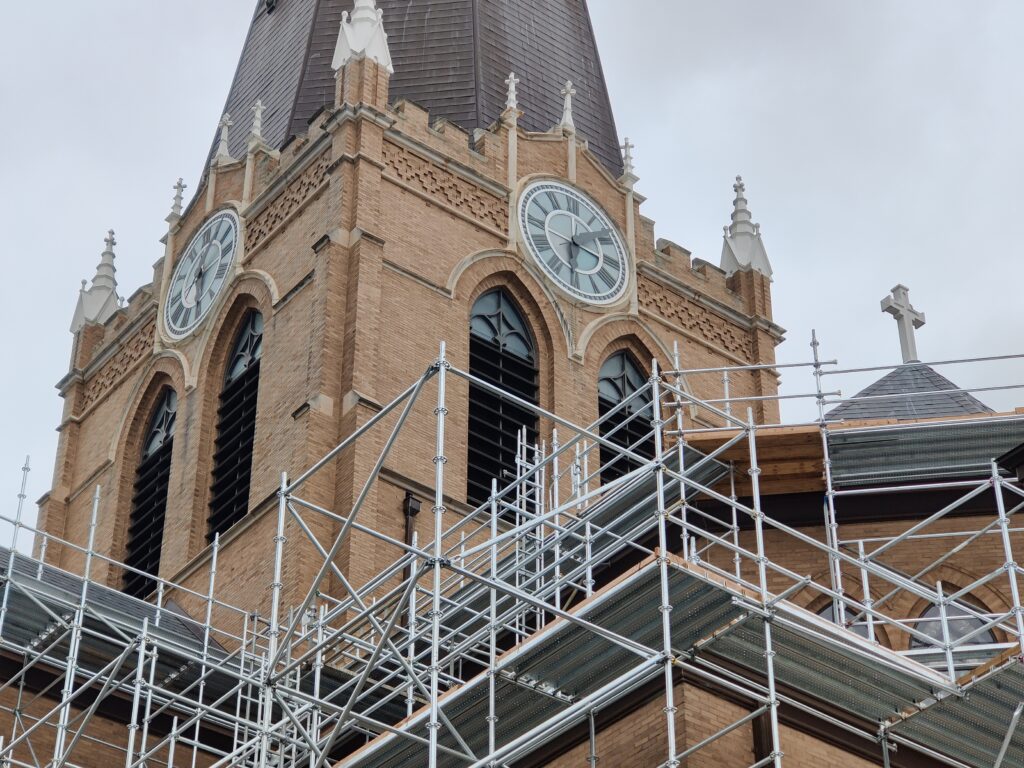 From now until December 2025, workers will install a new copper roof on the Cathedral. Scaffolding will encompass the church from the lower parts of the roof to the tops of the crosses.