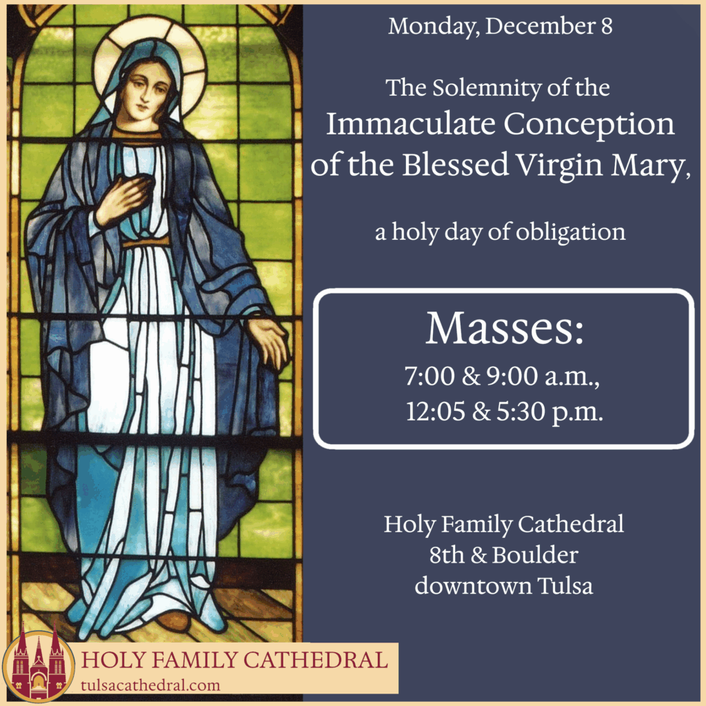 Monday, December 8 is the Solemnity of the Immaculate Conception of the Blessed Virgin Mary and is a holy day of obligation.