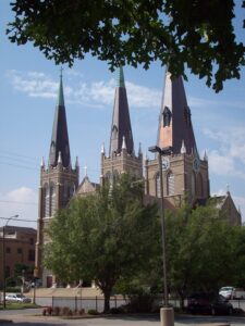 Holy Family Cathedral’s three towers are an iconic part of the Tulsa skyline. The church is in the middle of a project to replace the roof with solid copper shingles.