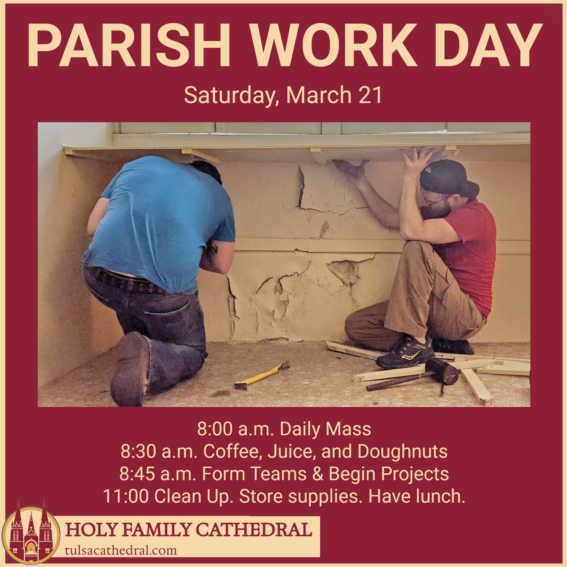 Parish Work Day: Saturday, March 21, 8:00 to Noon. Participants will join small teams to complete projects around the campus. A light breakfast and lunch is included.
