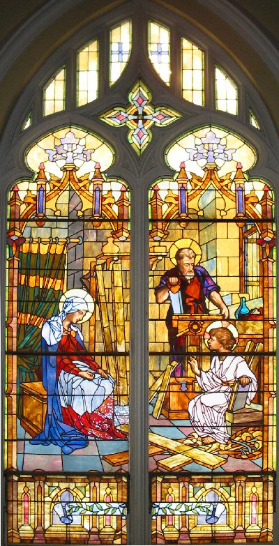 This window depicts the Holy Family working in Saint Joseph’s carpentry shop. As Saint Mary sews a garment in her lap, a young Jesus helps Saint Joseph. Note the cross at the feet of Jesus.