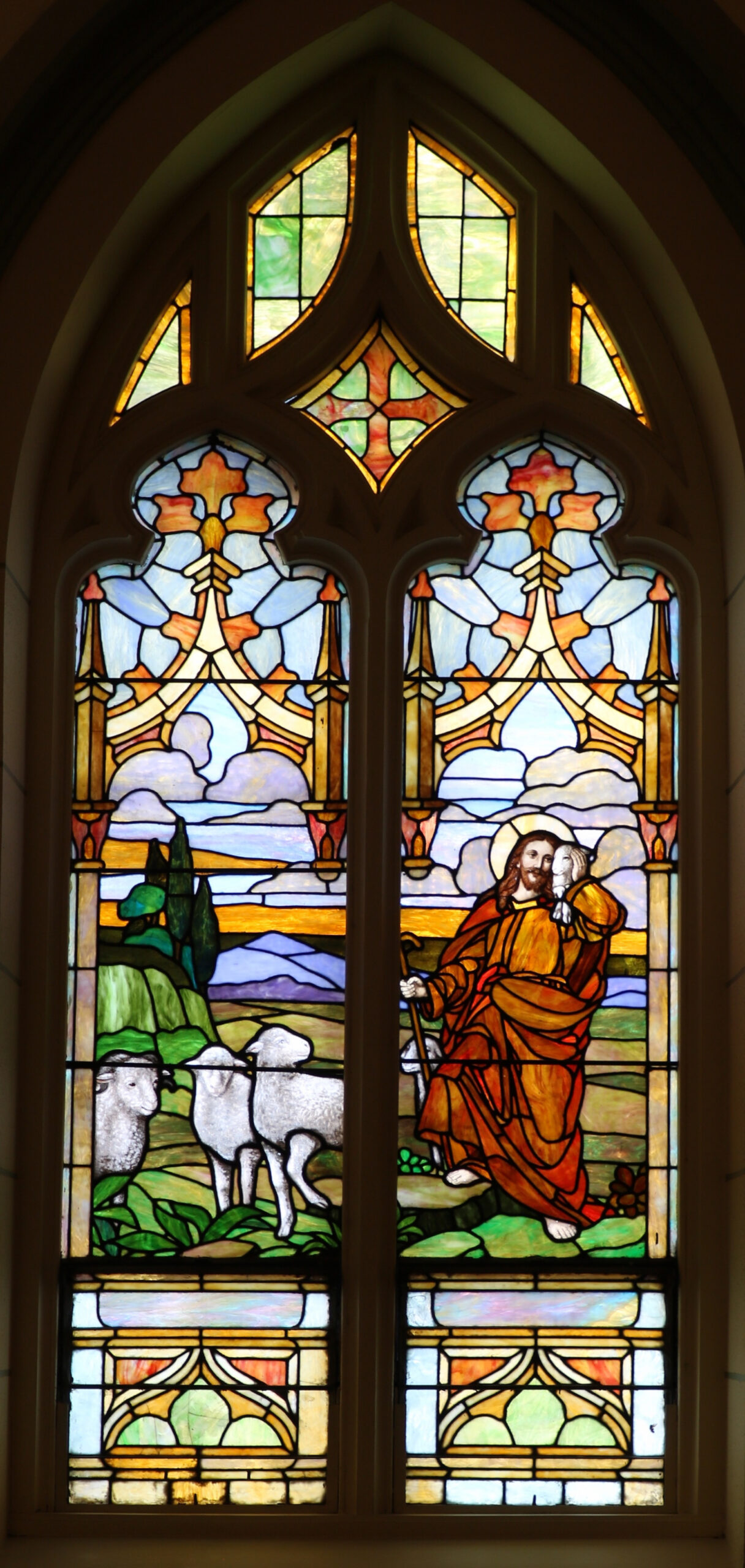 Inspired by Saint John’s Gospel, this window depicts Jesus on the cross with Saint Mary Magdalene, Saint Mary, and Saint John at the foot of the cross. The sigil on the cross bears the initials “I.N.R.I. (Jesus of Nazareth, King of the Jews.)” Jerusalem’s Temple is in the background.