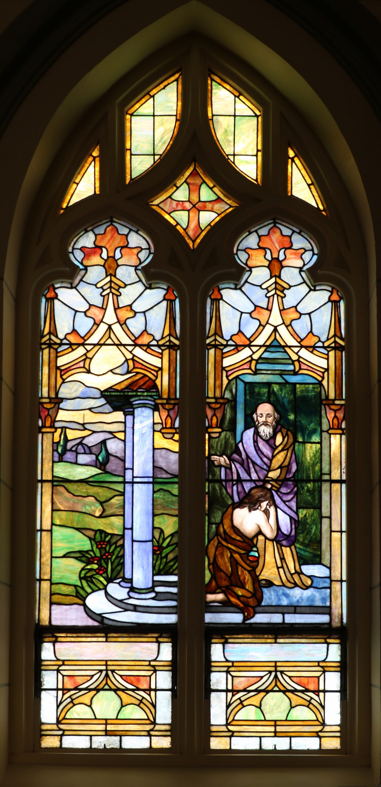 Holy Family’s confessionals are located in the transepts. The six lower windows of the transepts all have forgiveness as their theme.